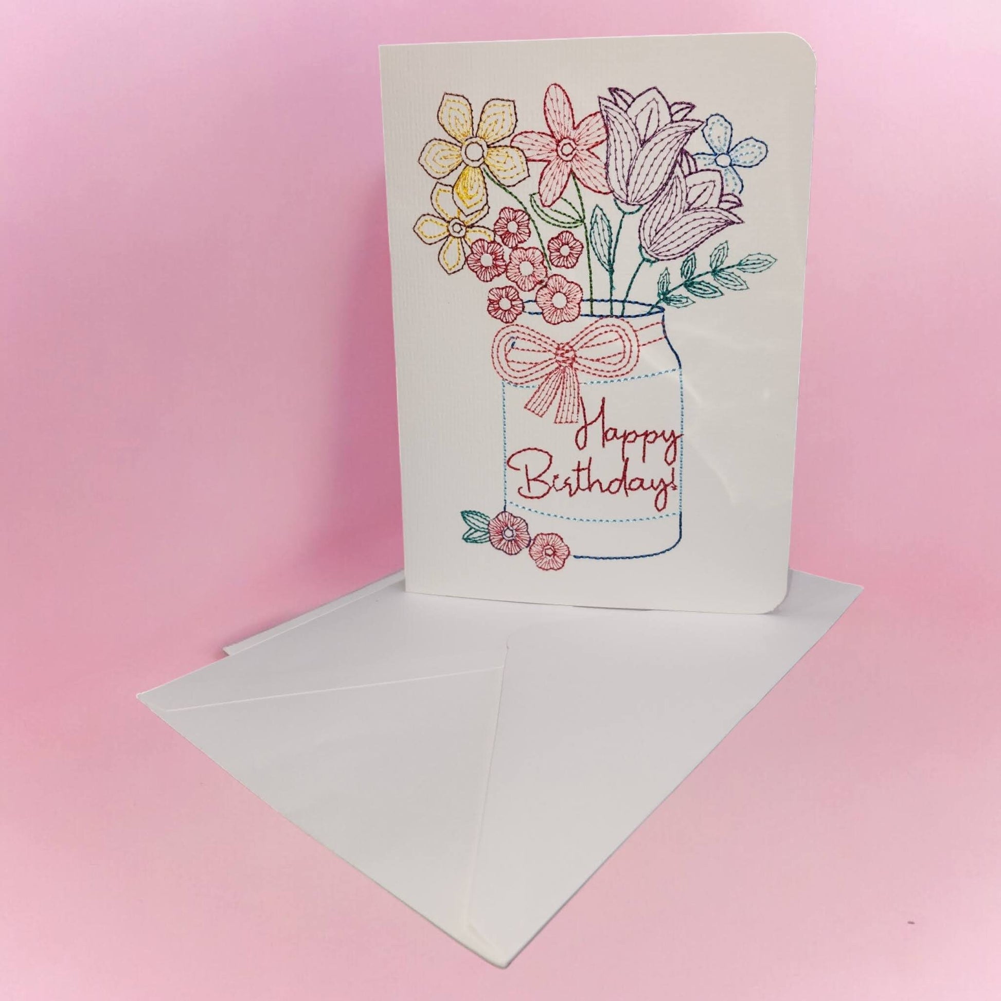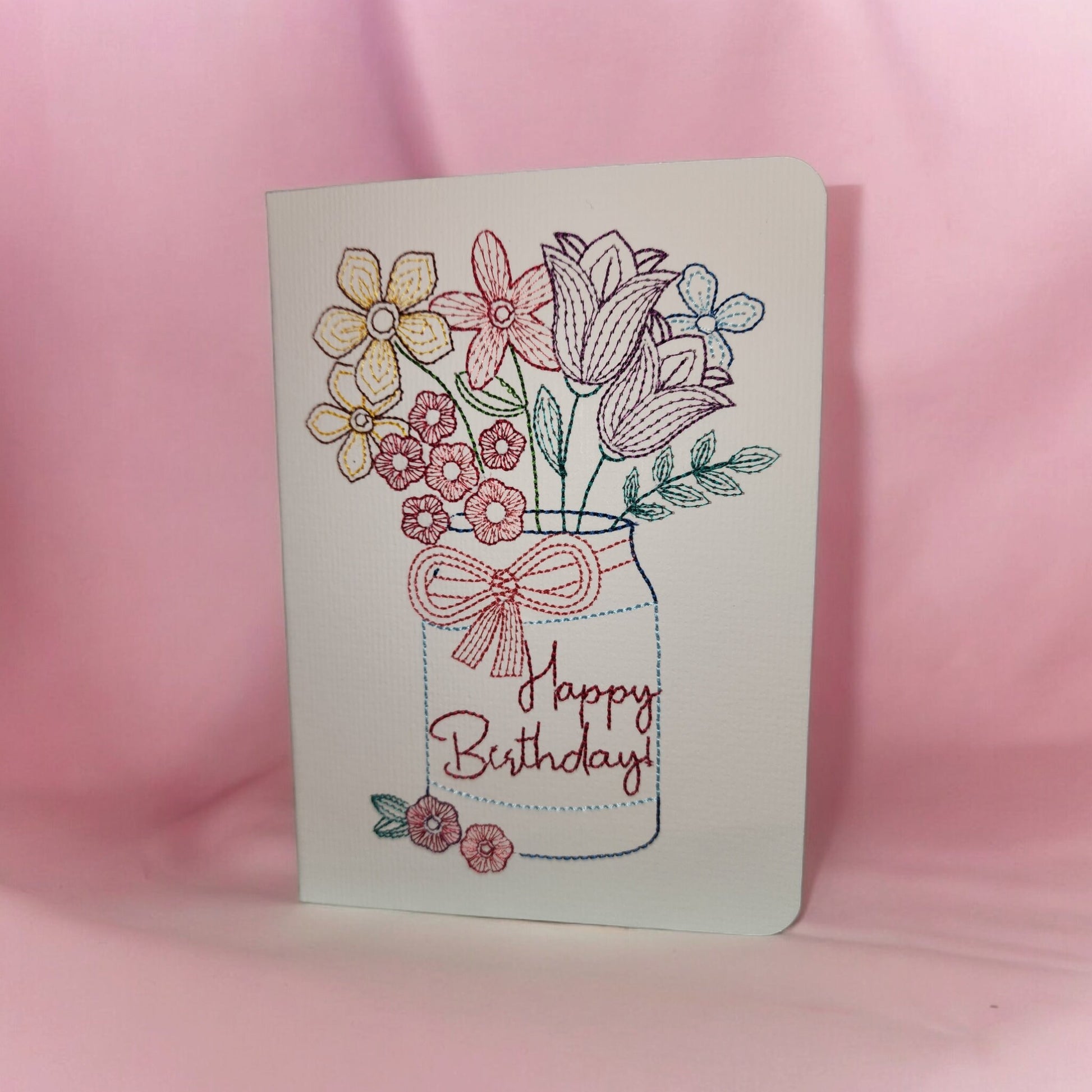 This beautiful handmade birthday card features a bouquet of flowers in a mason jar, embroidered on a cream card. The card is made of high-quality cream paper. The card is blank on the inside, so you can write your own personal message. Inside card color can be customized. Other designs available.